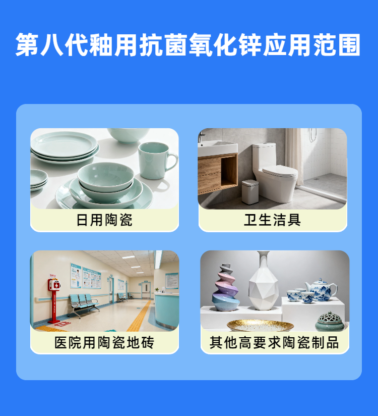 本產(chǎn)品是一款專為日用陶瓷(如餐具、杯盤)和 衛(wèi)生潔具(如馬桶、洗手盆、浴缸、浴室磚)以及公共及醫(yī)療設施(如醫(yī)院用陶瓷、學校食堂餐具)等釉面陶瓷制品設計的高性能功能性原料。它采用獨特的鋅基抗菌技術,在提供優(yōu)異抗菌性能的同時,兼具增白與助熔效果,旨在為客戶提供一種安全、高效、經(jīng)濟且易于應用的基礎釉料健康升級解決方案。