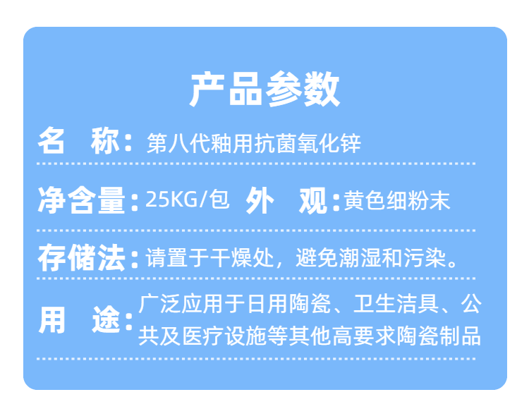 本產(chǎn)品是一款專為日用陶瓷(如餐具、杯盤)和 衛(wèi)生潔具(如馬桶、洗手盆、浴缸、浴室磚)以及公共及醫(yī)療設施(如醫(yī)院用陶瓷、學校食堂餐具)等釉面陶瓷制品設計的高性能功能性原料。它采用獨特的鋅基抗菌技術,在提供優(yōu)異抗菌性能的同時,兼具增白與助熔效果,旨在為客戶提供一種安全、高效、經(jīng)濟且易于應用的基礎釉料健康升級解決方案。